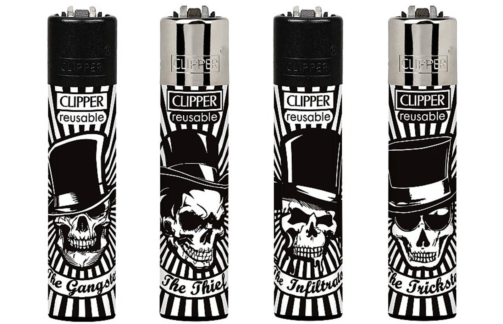 The Set includes rare Top Hat Black And White Skulls Themed CLIPPER® lighters.
